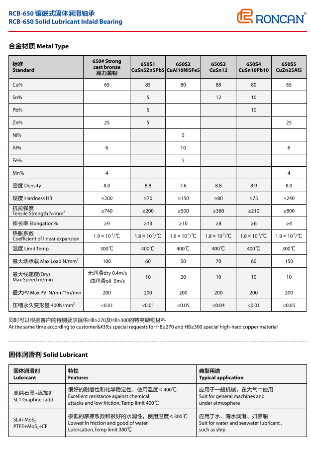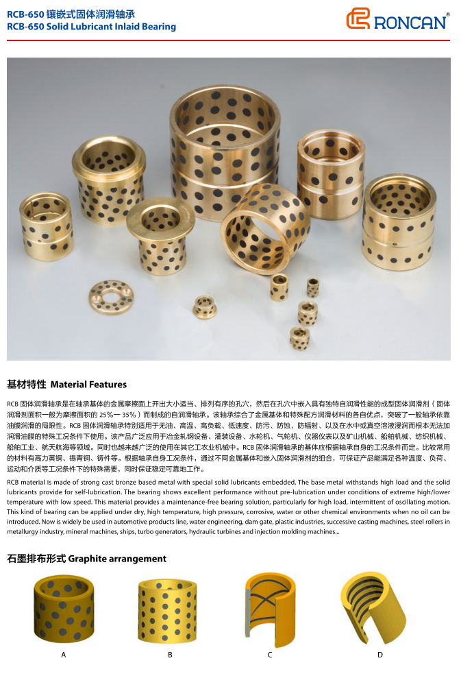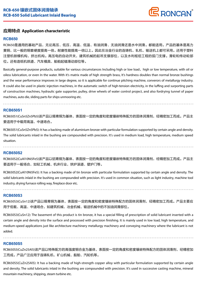 RCB650是通用的基礎(chǔ)產(chǎn)品,無(wú)論高壓、低壓、高溫、低溫、有油潤(rùn)滑、無(wú)油潤(rùn)滑還是水中潤(rùn)滑。都能適用。產(chǎn)品的基體是高力黃銅,比一般的銅套硬度提高一倍。耐磨性能提高一倍以上。因此在冶金行業(yè)的連鑄機(jī)、軋機(jī)、輸送機(jī)上都可采用。還用于塑料注塑機(jī)鎖模機(jī)構(gòu),擠出機(jī)構(gòu)。高壓電的自動(dòng)開(kāi)關(guān),建筑機(jī)械的起吊支撐部位,以及水利樞紐工程的弧門支撐?;喓蛡鲃?dòng)輪部位。還有造紙機(jī)烘道、汽車模具、船舶起錨滑動(dòng)部位等。